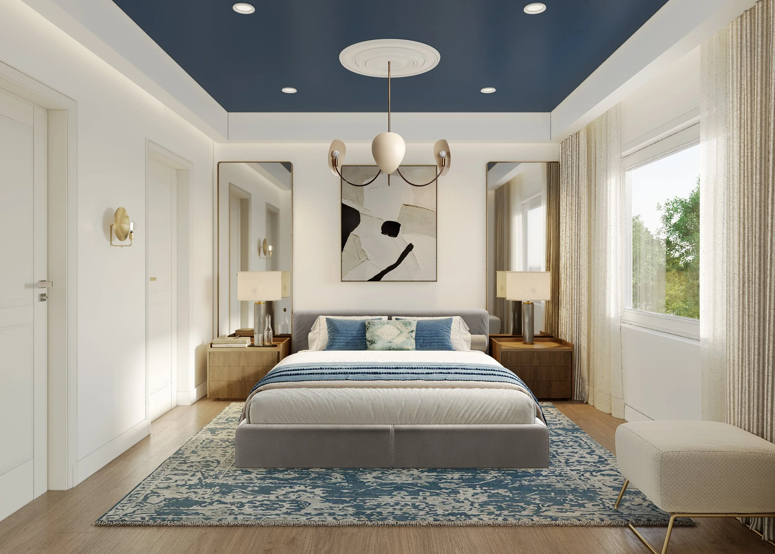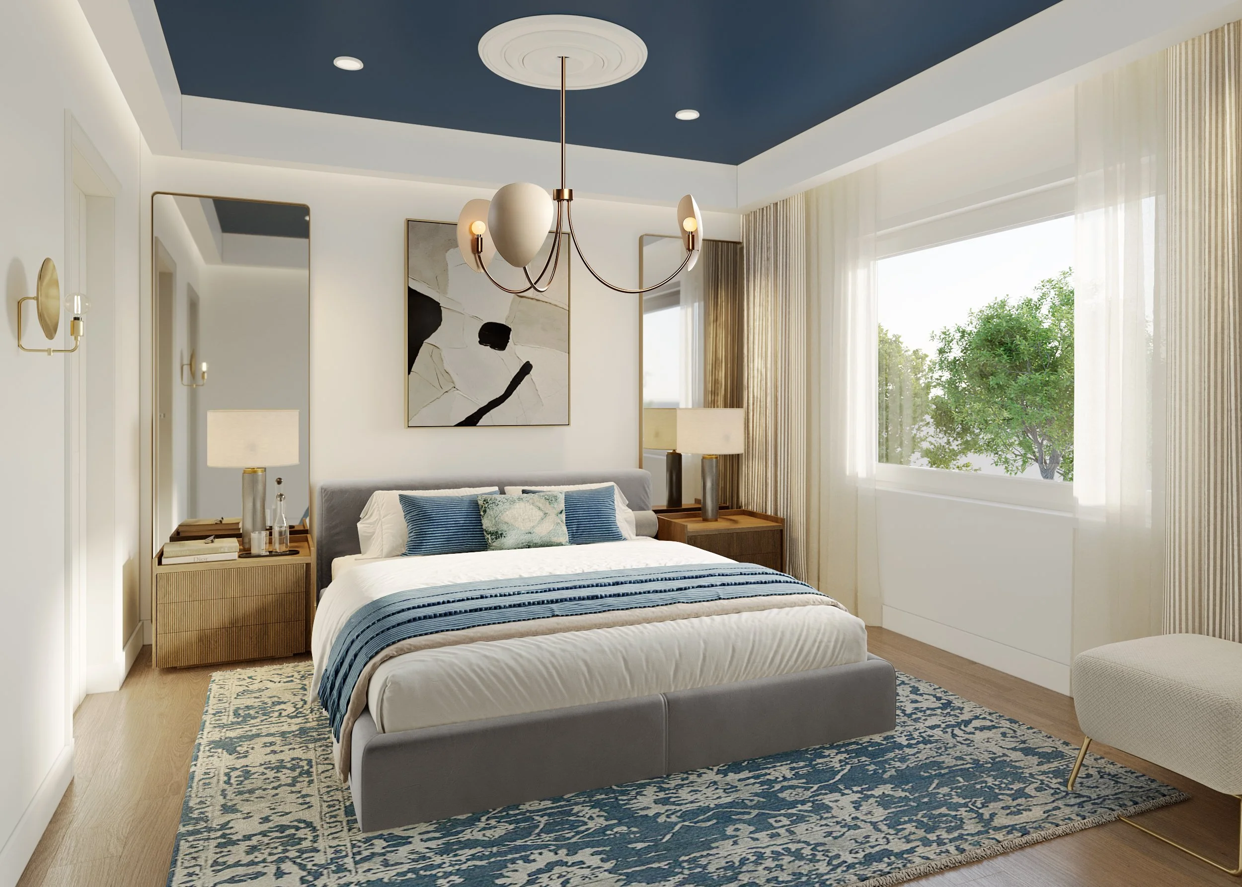 The Norris family wanted to revamp their guest bedroom. They had existing furniture they wanted to incorporate into the new design for the space. The home is located on the water looking out to Lake Washington. The guest bedroom itself has a beautiful view of the water and the trees surrounding the property. Without being too literal we selected the turquoise color to add a pop of color to the space while playing homage to the exquisite water views. The room is a cozy size and because of that we incorporated design elements that would bring the eye up and give the illusion of feeling larger.